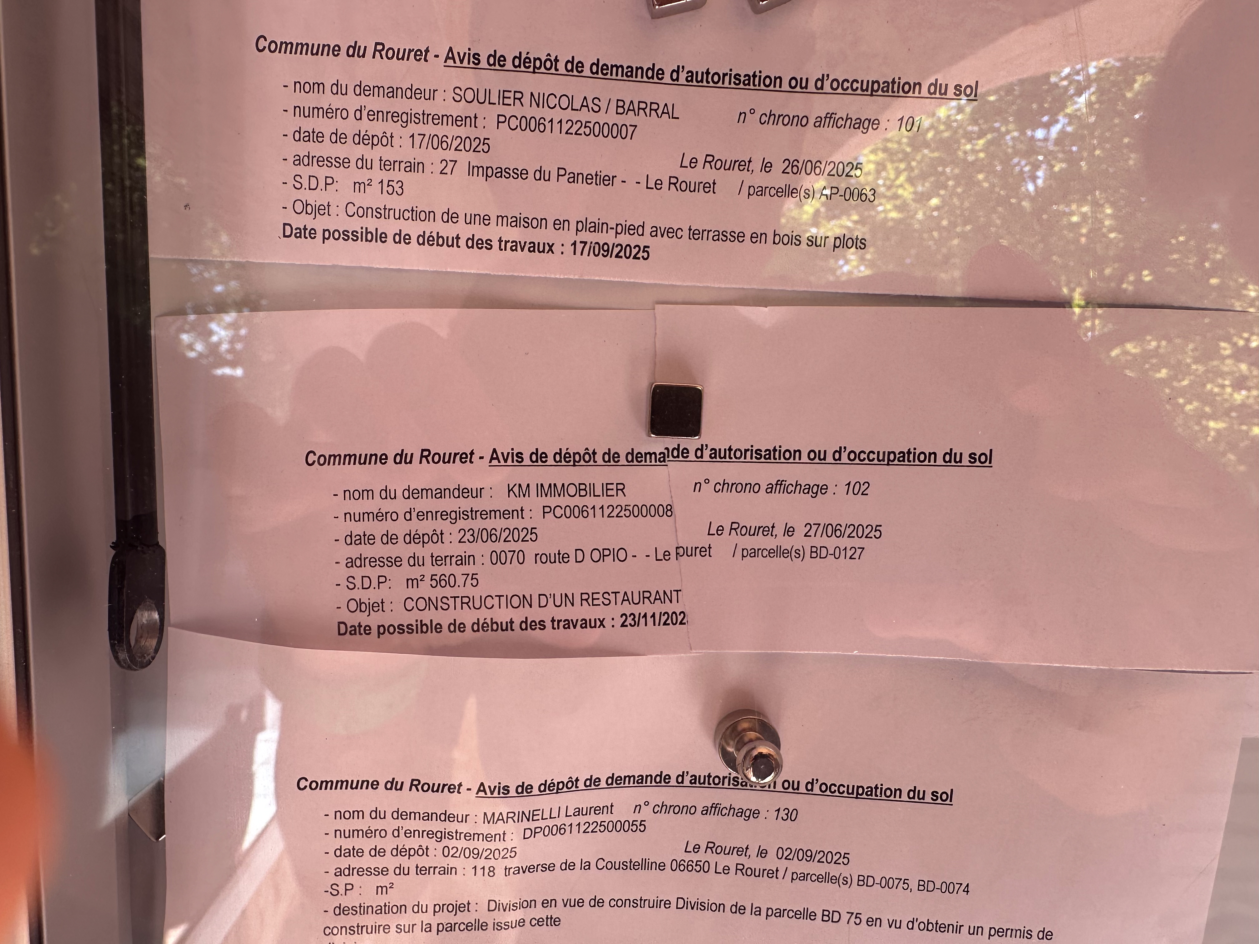 Le permis a été déposé le 23/06/2025 par KM immobilier pour construire un restaurant au 70 Route d'Opio. La mairie a mis des contraintes dans le cadre de ce que lui permet le PLU (architecture, sécurité, etc) et la dernière mouture est en instruction. La date limite de validation du permis est le 23/11/2025. Le permis n'est pas encore accordé.