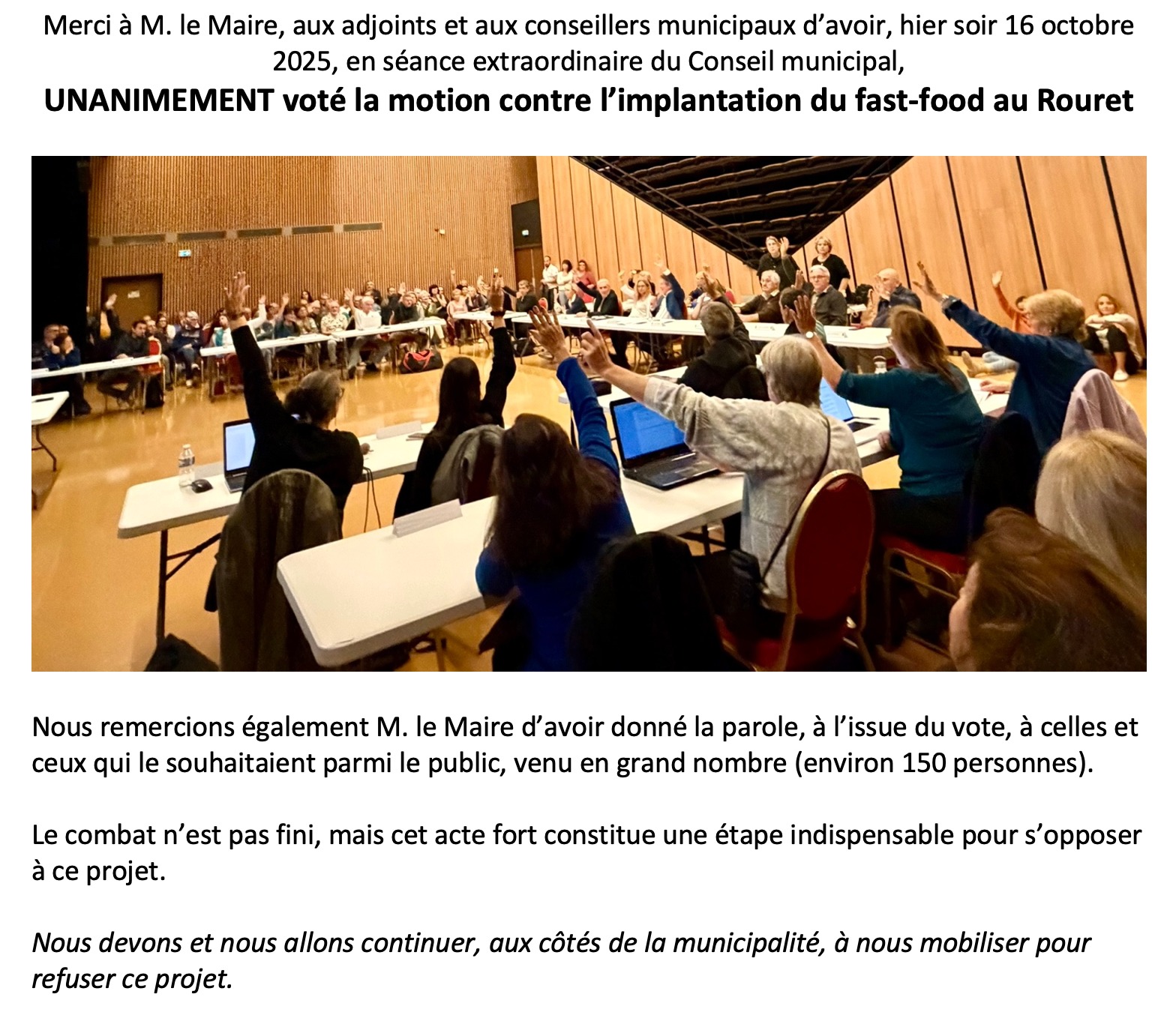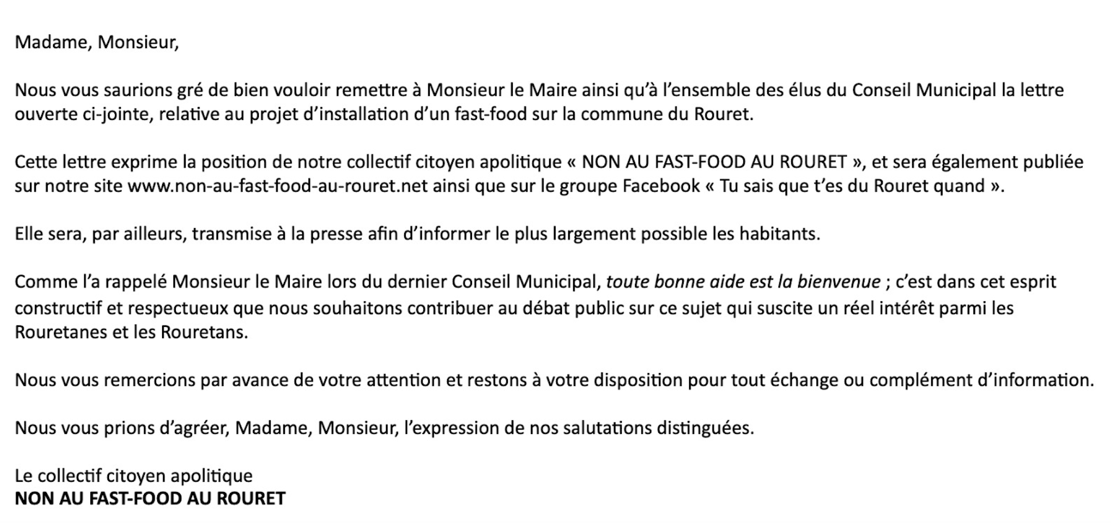 - Notre collectif "NON AU FAST FOOD AU ROURET" est un collectif citoyen et apolitique. Nous avons envoyé aujourd’hui 15 octobre 2025 à tous les conseillers municipaux la lettre ci-dessous pour aider la municipalité à alimenter le débat avec des sujets qui nous tiennent à coeur.