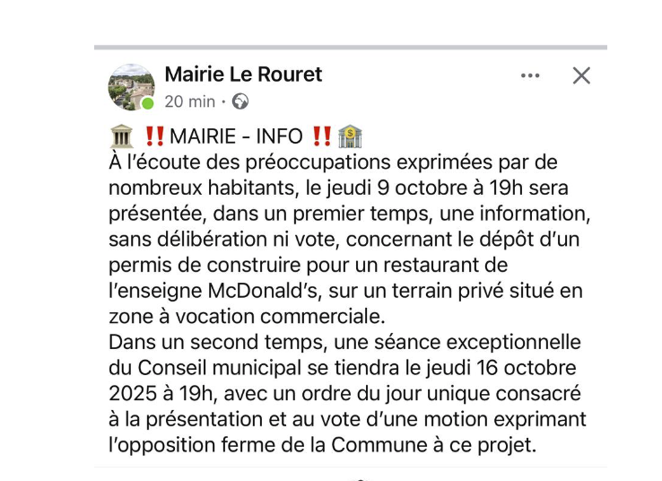 - ⁠Nous remercions le maire pour cette information pour la population, nombreuse ce soir-là. Un conseil municipal extraordinaire se tiendra le 16 octobre a 19h pour débattre du projet et procéder au vote par le conseil municipal d'une motion "contre l’installation d’un fast food au Rouret".